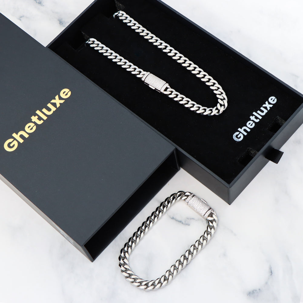 8mm Plain White Gold Cuban Link Chain+Bracelet with Moissanite Box Clasp