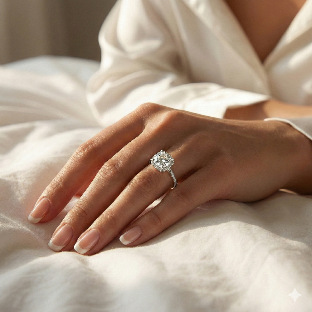 Adorned Cushion Halo Round Cut Moissanite Ring